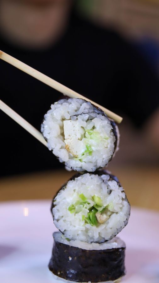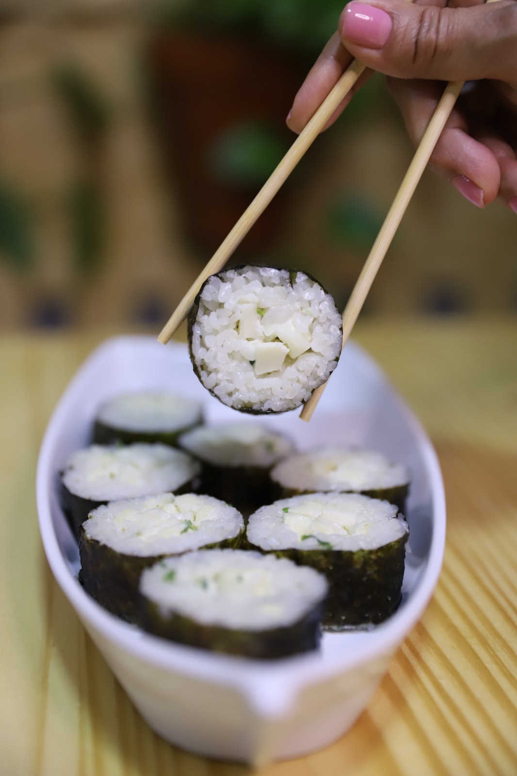 ARROZ, NORI, ALHO PORO, TOFU, CREAM CHEESE VEGANO, (RICE, SEAWEED, LEEK, TOFU, VEGAN CREAM CHEESE)