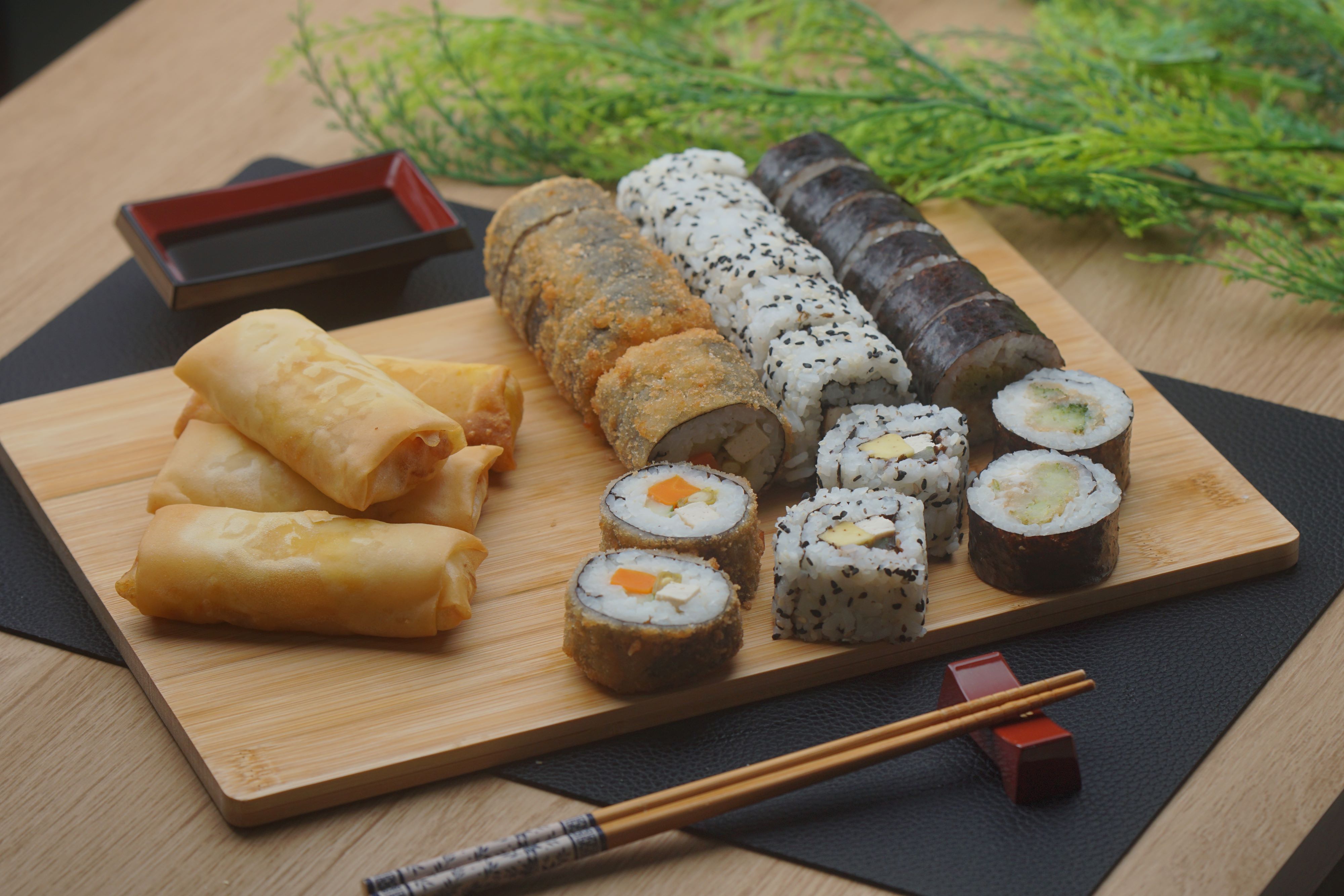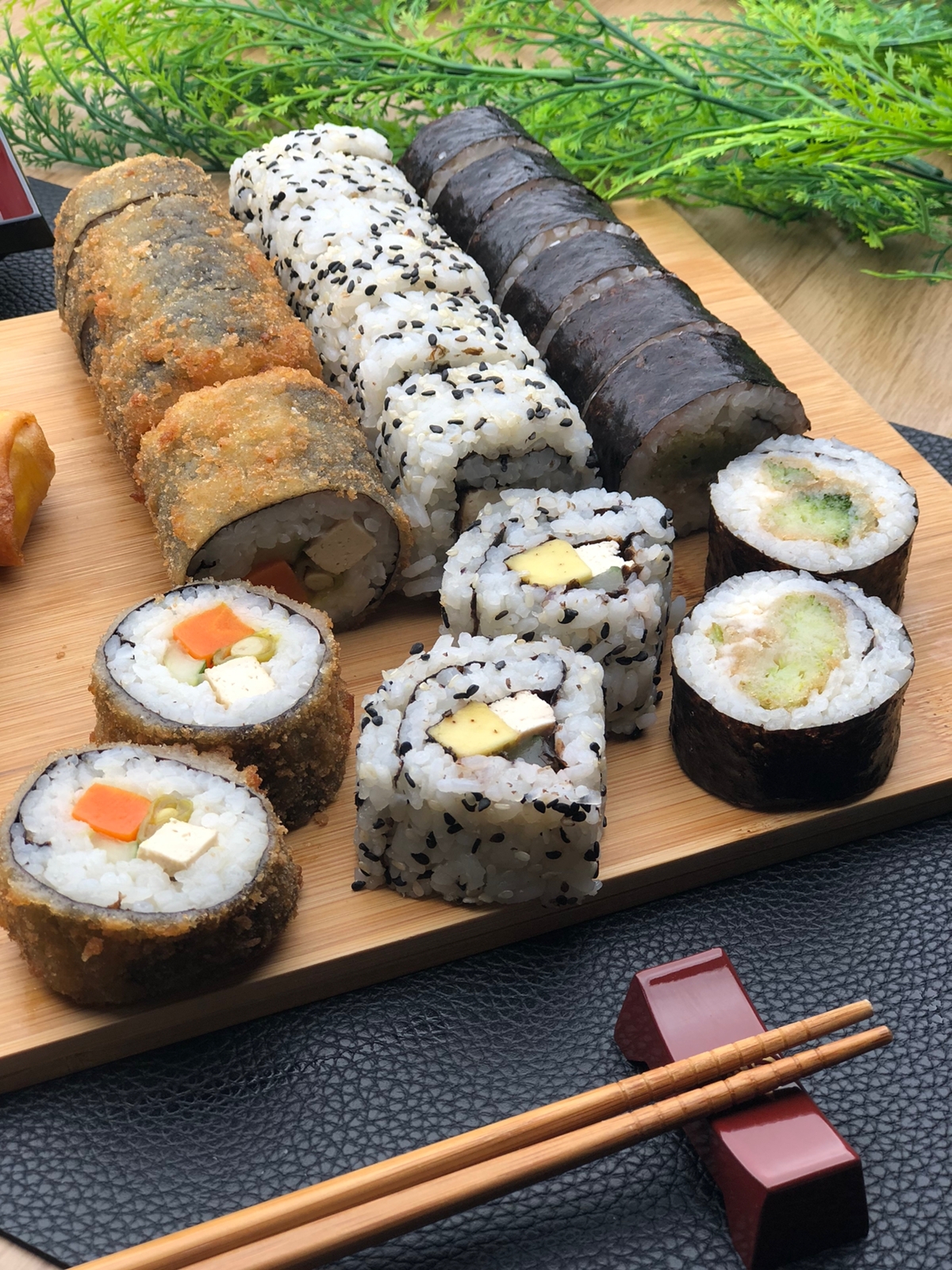 URAMAKI CALIFÓRNIA VEG + FUTOMAKI DE BRÓCOLIS + FUTOMAKI DE LEGUMES HOT + HARUMAKI LEGUMES